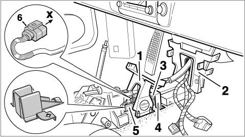 In case of first-time installation of the new/current rate-of-turn sensor, the front center console support -1and the holder -2- must be replaced. The following parts are omitted: The bow -4- over the rate-of-turn sensor -3- and the cable guide -5-. The adapter plug -X- must be installed between the plug -6- and the rate-of-turn sensor -3-.