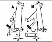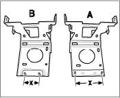 5. Prepare new/current support -B- (with dimension X = approximately 8 mm) for installation. Distinguishing characteristics: Dimension X and diameter of the hole -arrows-. Dimension X of the holder for the first version -A- approximately 12 mm.
