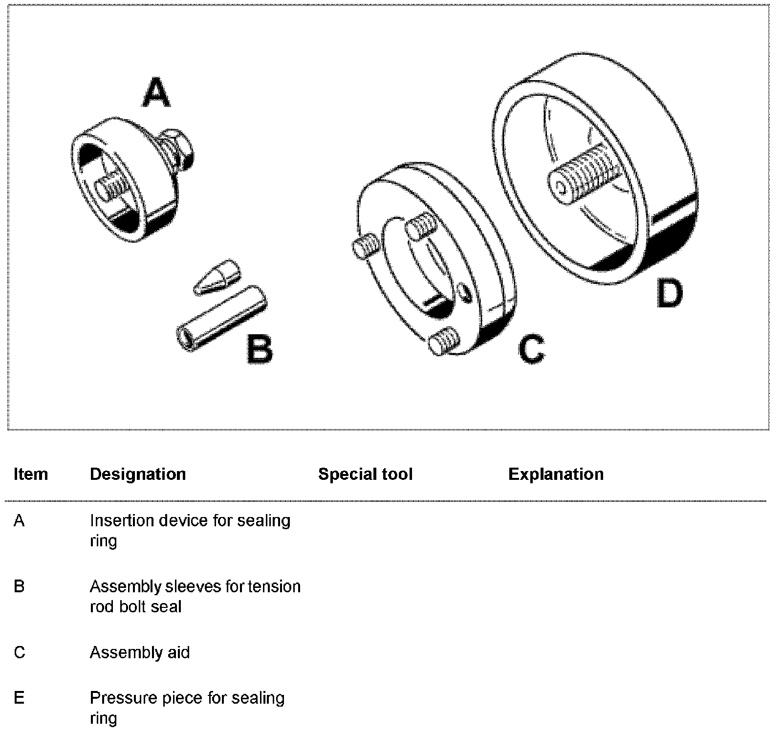- Prepare four tension rod bolts. Push sealing washers on to tension rod bolts. Feed lightly oiled O-rings with conical sleeve from special tool 9511 over the threaded area and push them on to the tapered section towards the head of the bolt.
