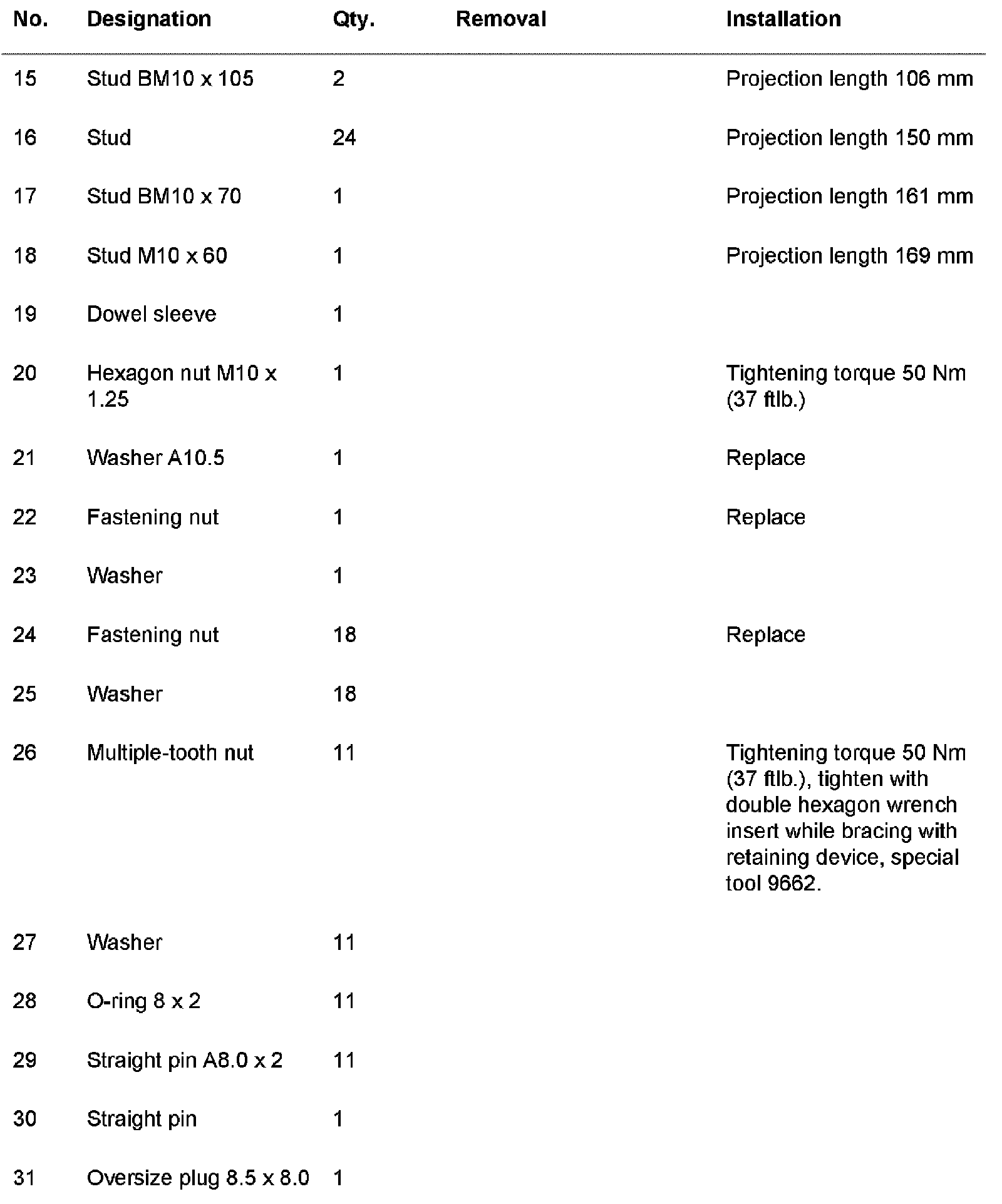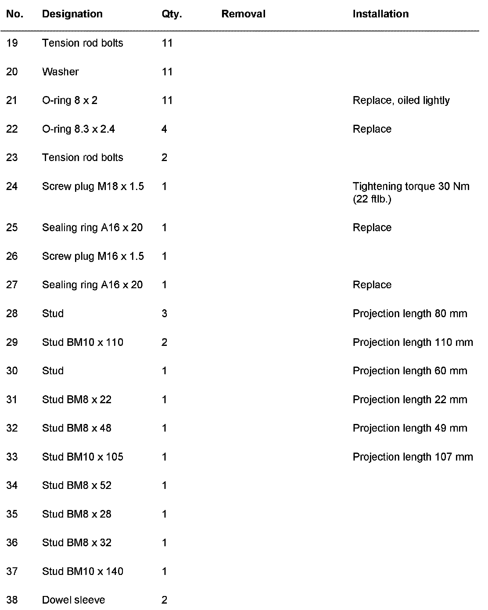 34. Tighten tension rod bolts or studs with 50 Nm (37 ft. lbs.). When doing so, observe the tightening sequence.