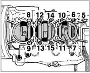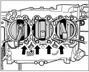 ^ The tension rod bolts in thrust blocks 2, 3, 4 and 5 -arrows- can only be removed after removing the crankcase half (cylinder bank 1 - 3). Removing tension rod bolts.