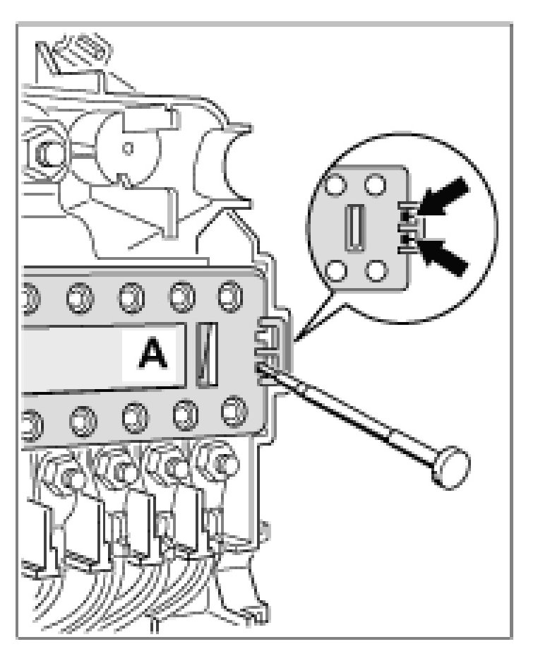 2. Carefully lever off the cover -A-, e.g. with a screwdriver -arrow-. This will break the locking tabs and the cover can be removed.