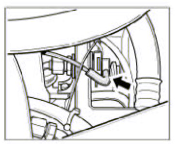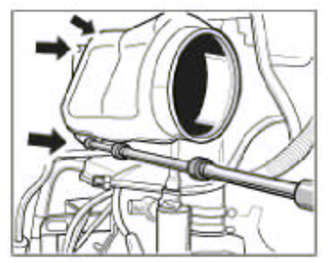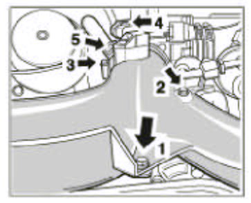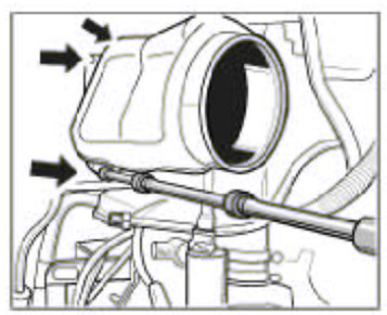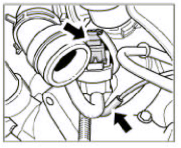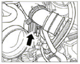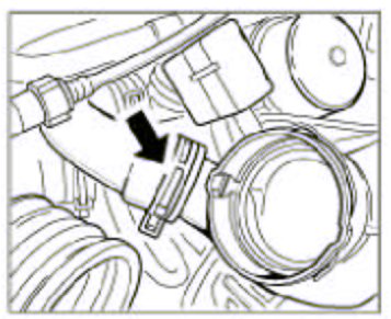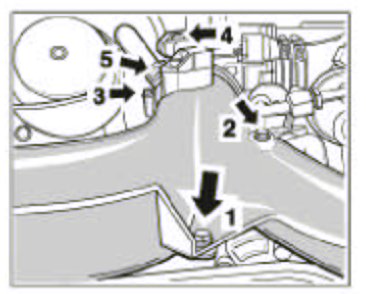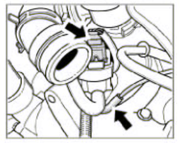 7. Remove the pressure hoses on the left and right of the Y-shaped pipe to the charge air cooler. To do this, unclip the retaining clips using a screwdriver and pull out the hose. Refit the retaining clips immediately.