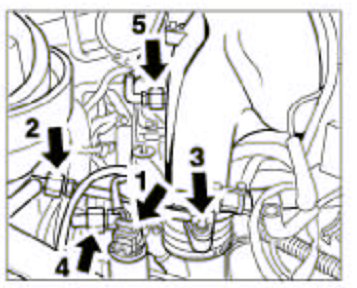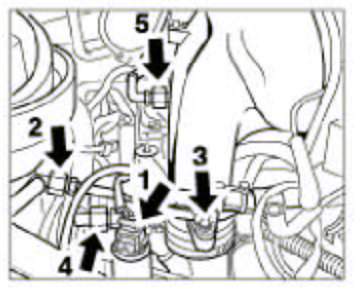9. Remove the Y-shaped pressure pipe. To do so, undo the hose clamps -3 and 5- and the hexagon-head bolts -1 and 2-. Disconnect pressure sensor plug -4-.