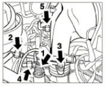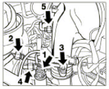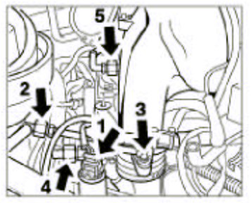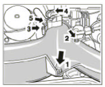 4. Remove the Y-shaped pressure pipe. To do so, undo the hose clamps -3 and 5- and the hexagon-head bolts -1 and 2-. Pull off pressure sensor plug -4-.