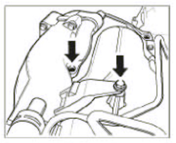 13. Loosen and unscrew the three fastening screws -arrows- at the front intake pipe connector.