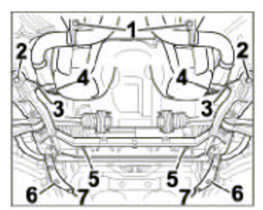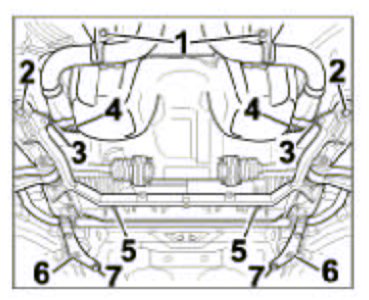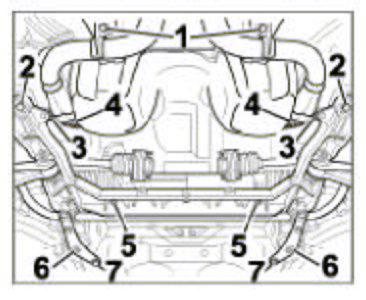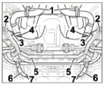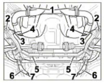 15. Detach suspension subframe. Undo the six hexagon-head bolts at the front and rear -Items 2, 6 and 7- and lower complete suspension subframe by approx. 15 cm.