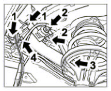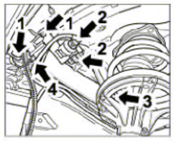 7. Fasten coolant pipes at front. To do this, insert two aluminium pipes and a vent line in the network into the corresponding coolant hoses and fit the five spring-band clamps (1 clamp for vent line on the distributor hose in the left front wheel well -Item 2- and four clamps for coolant pipes -Item 4 in next figure-).