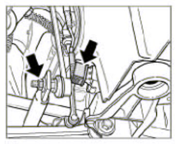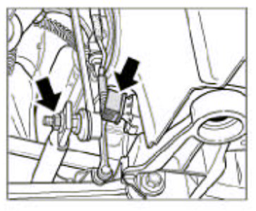 14. Support suspension subframe with a transmission jack. Pull off the cable plug on the sensor of the headlight beam adjustment -right arrow-. Detach stabilizer from the mount. To do this, remove the hexagon nut M10 from each joint -left arrow in the Figure-, countering with an open-ended wrench at the joint hexagon.