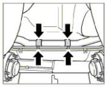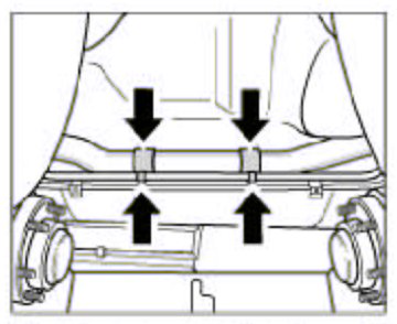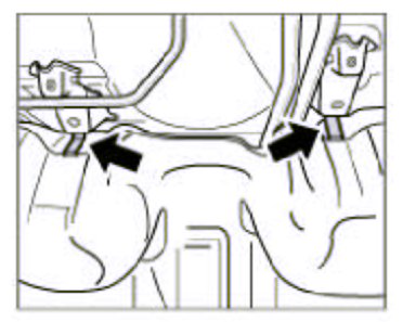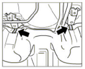 4. Pre-position connector tubes to the radiators together with pre-mounted holders (replace if necessary) in installation position under the fuel tank. Clip holders to the body. To do this, hook the holders at the front and engage the tab at the rear. Push the left and right pipes into coolant hoses and tighten screw-type hose clamps.