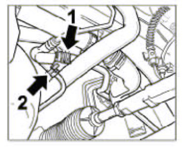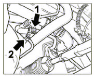 5. Insert vent line into distributor hose in the left front wheel well -2- and into coolant hose in the right front wheel well and fit the spring-band clamps.