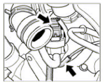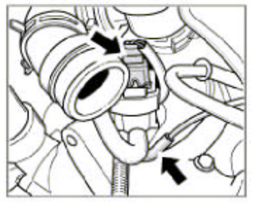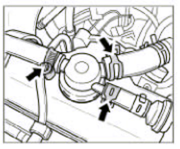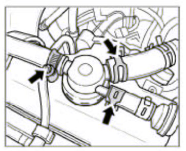 3. Undo the 2 spring band clamps and the screw-type hose clamp -arrows- and pull off the hoses.