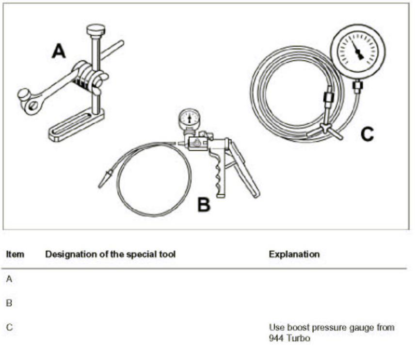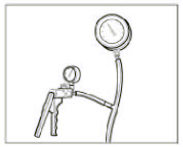 7. Produce overpressure of 0.5 bar with special tool tester 9160/1. Read off pressure on special tool pressure gauge 9103/2. Have a second person read off the stroke of the push rod on the dial gauge at the same time.
