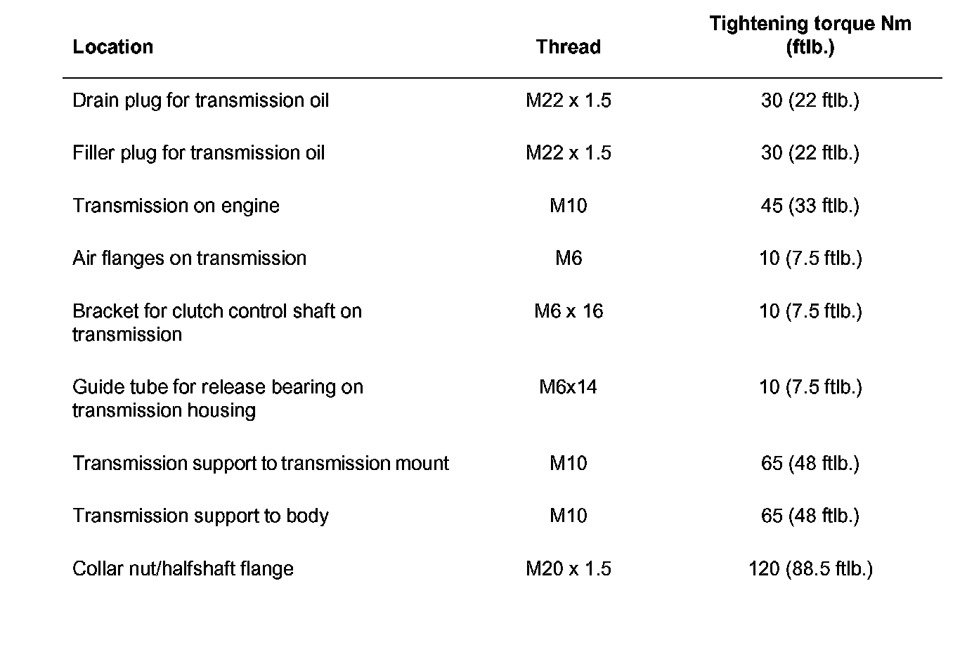 Manual transmission tightening torques: