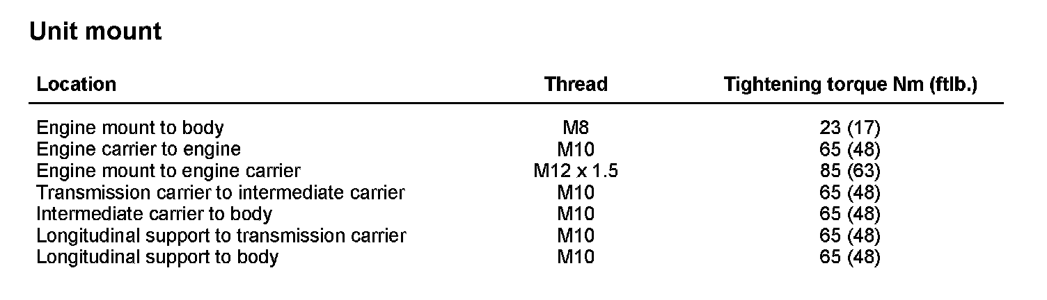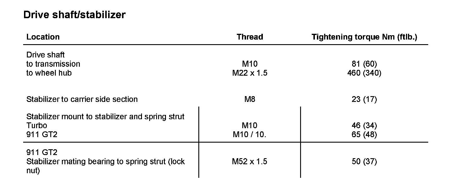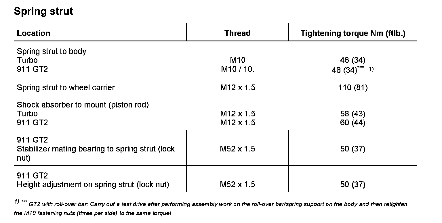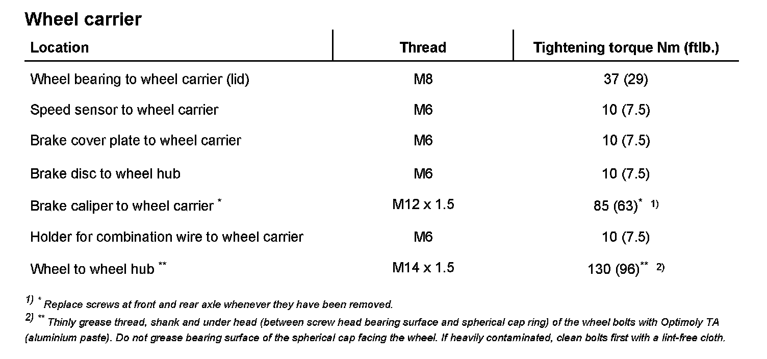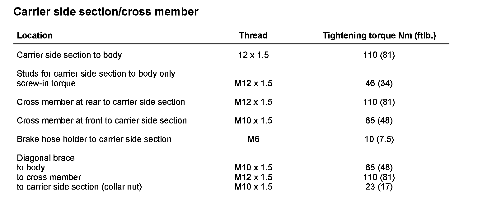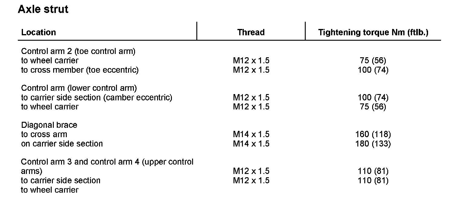Tightening torques for rear axle