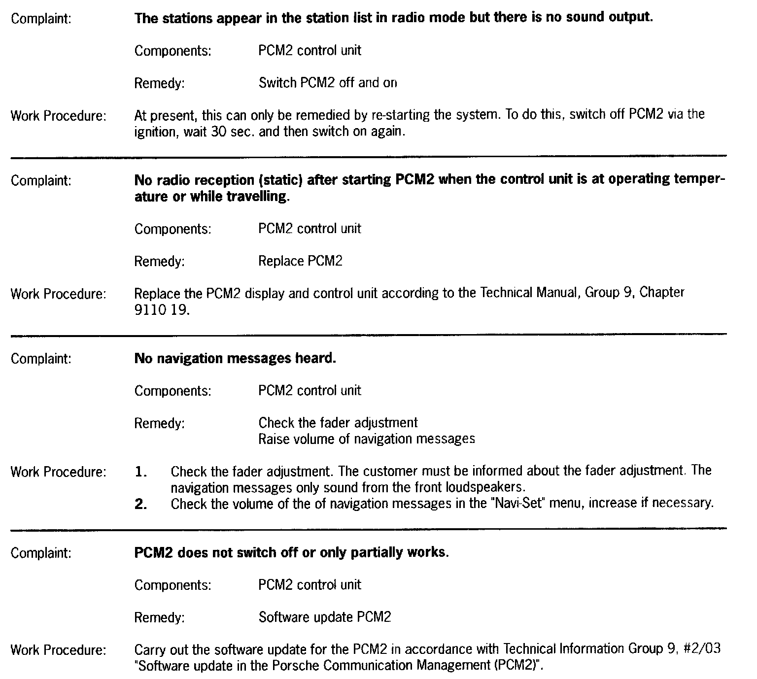 Carry out the software update for the PCM2 in accordance with Technical Information Group 9, # 2/03 - "Software update in the Porsche Communication Management (PCM2)".