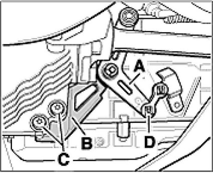 9. Remove transmission lever -A- from the transmission housing. To do this remove retaining clamp -D- from the pivot point. Undo the transmission lever holder screws -C- and remove the transmission lever holder -B-.