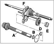 1. Insert output shaft -A- with adjusting shim S5 -Band adjusting shim S4 -C- into tensioning plate -F-.