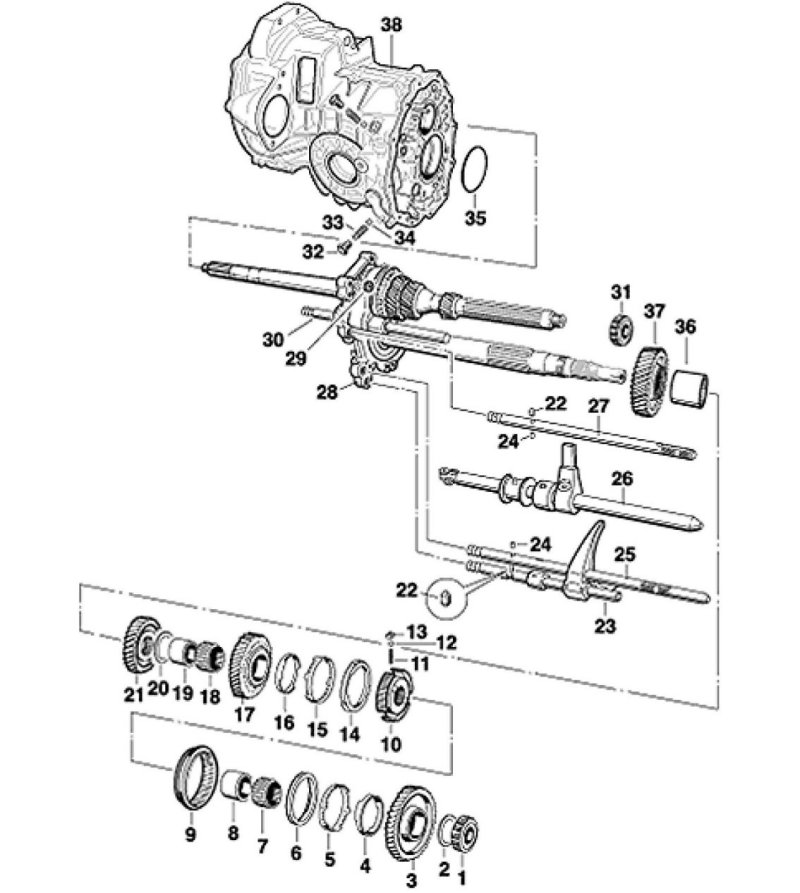 10. Remove fixed gear wheel, 5th gear (no. 36 in overview) and the spacer sleeve (no. 35 in overview).