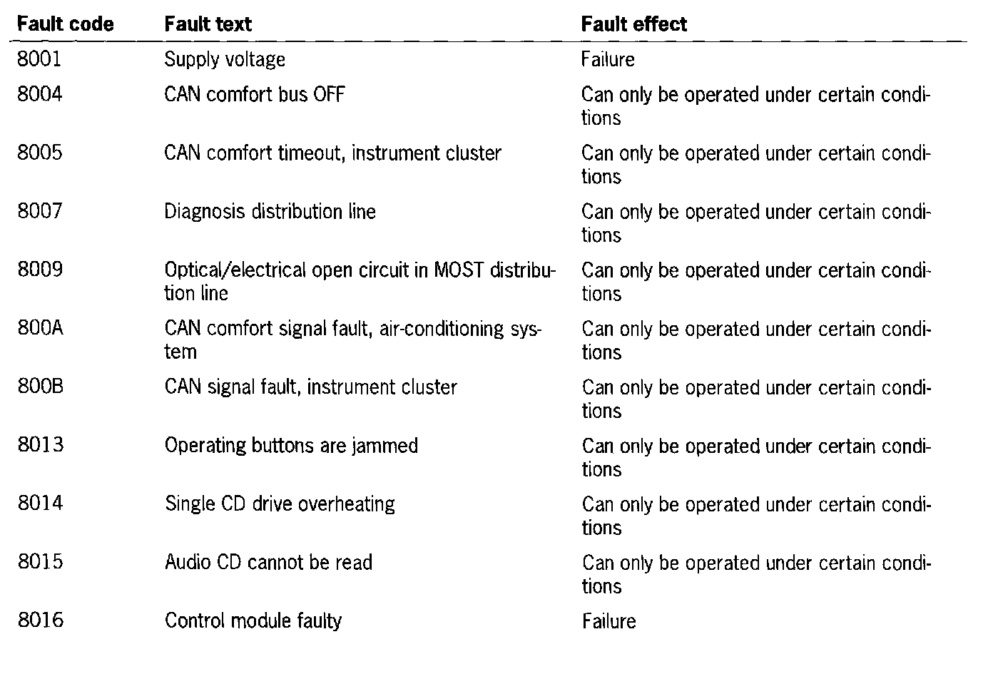 Fault Code 8001 - 8016: