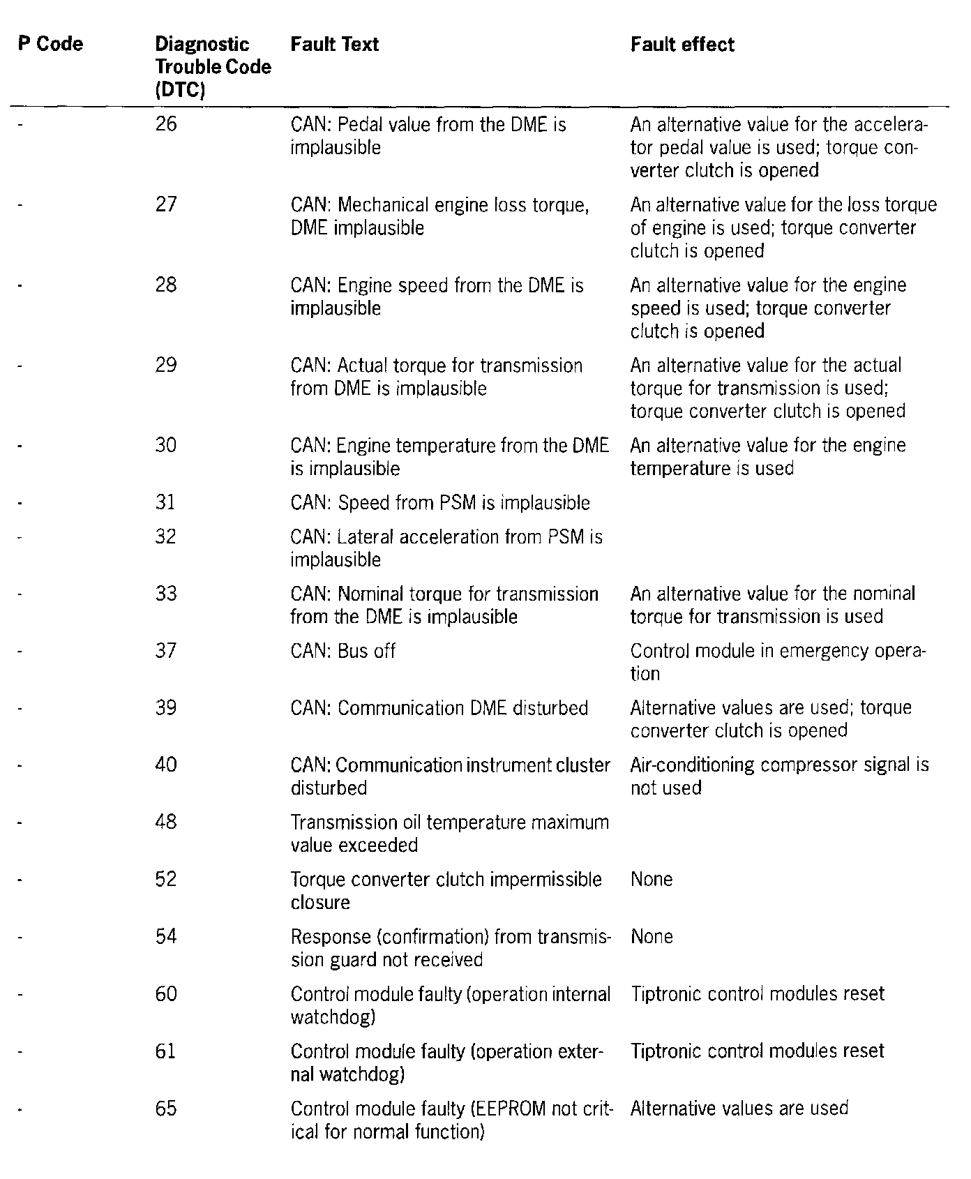P Code, Diagnostic Trouble Code (DTC), Fault Text, Fault Effect