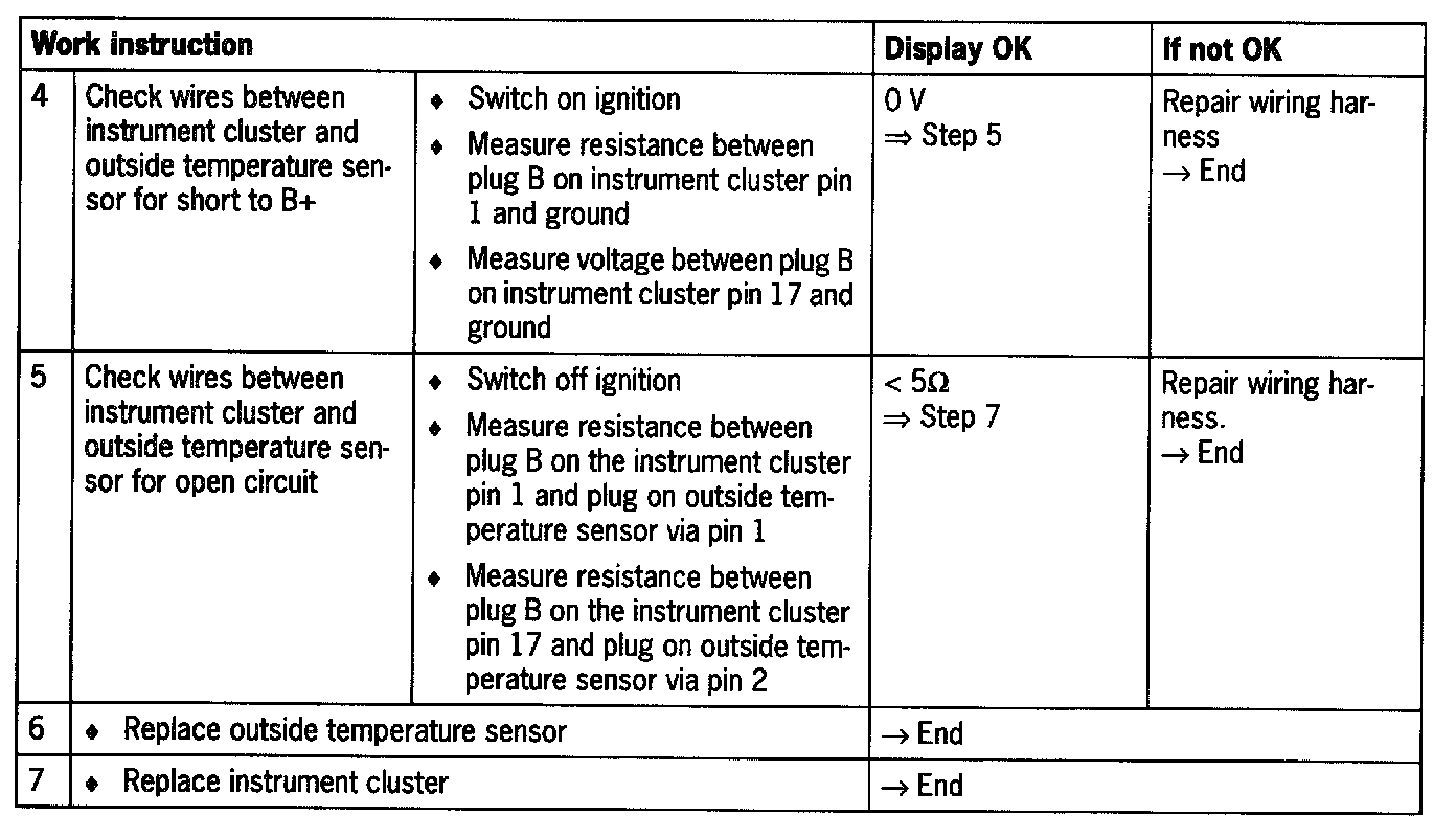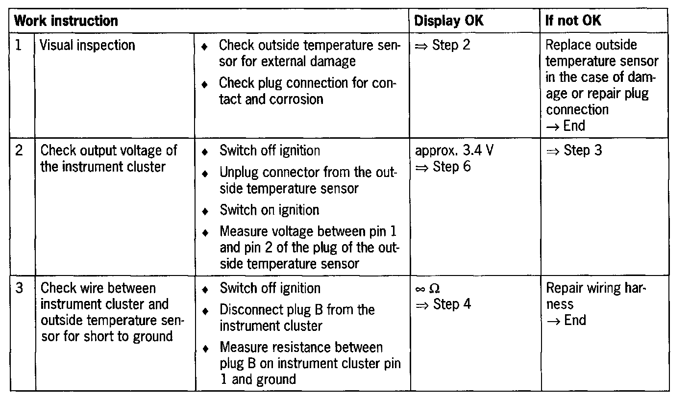 - Short circuit to voltage/ground or open circuit in the wiring between the instrument cluster and the outside temperature sensor