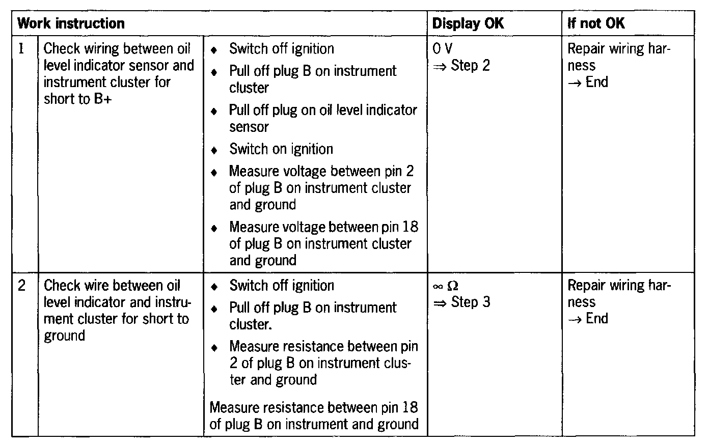 - Short circuit to B+/ground or open circuit in wiring between oil level indicator sensor and instrument cluster