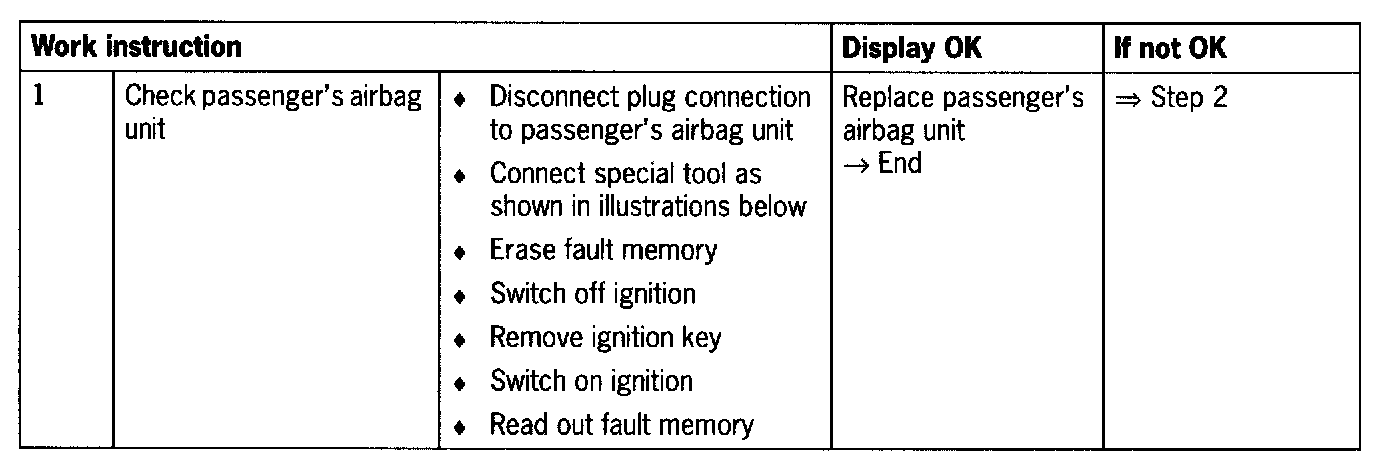 Test tool No. 9516 and adapter cable No. 9566 instead of passenger's airbag unit
