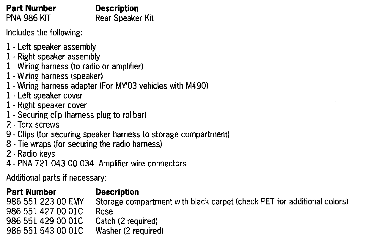 On vehicles without rear speakers, a retrofit kit is now available to install them. They are installed in the hard plastic storage compartment behind the seats. The addition of rear speakers will enhance stereo imaging and add the fader function to the radio. The kit can be installed in Boxsters with either the base radio system M 441 (dashboard speakers) or optional M490 system (Harman Amplifier). The hard plastic storage compartment must be ordered if the vehicle is not equipped with one.