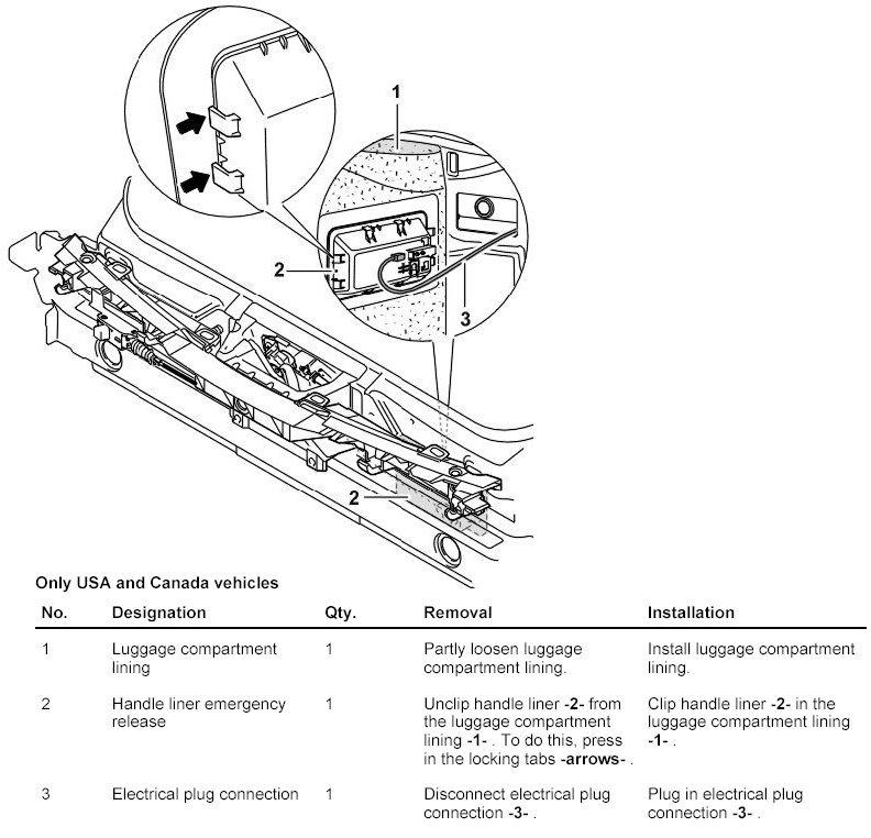 2. Unlock unlocking lever in the luggage compartment. Check whether the upper part of the lid lock disengages automatically.