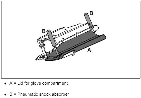 1.1. Press the pneumatic shock absorber -1- out of the fastening tab -arrow B-. Turn the pneumatic shock absorber by 90 degrees anti-clockwise in the direction of arrow -A- and guide it out of the glove compartment.