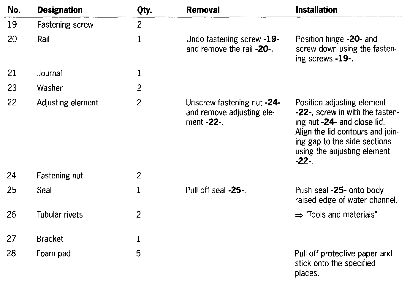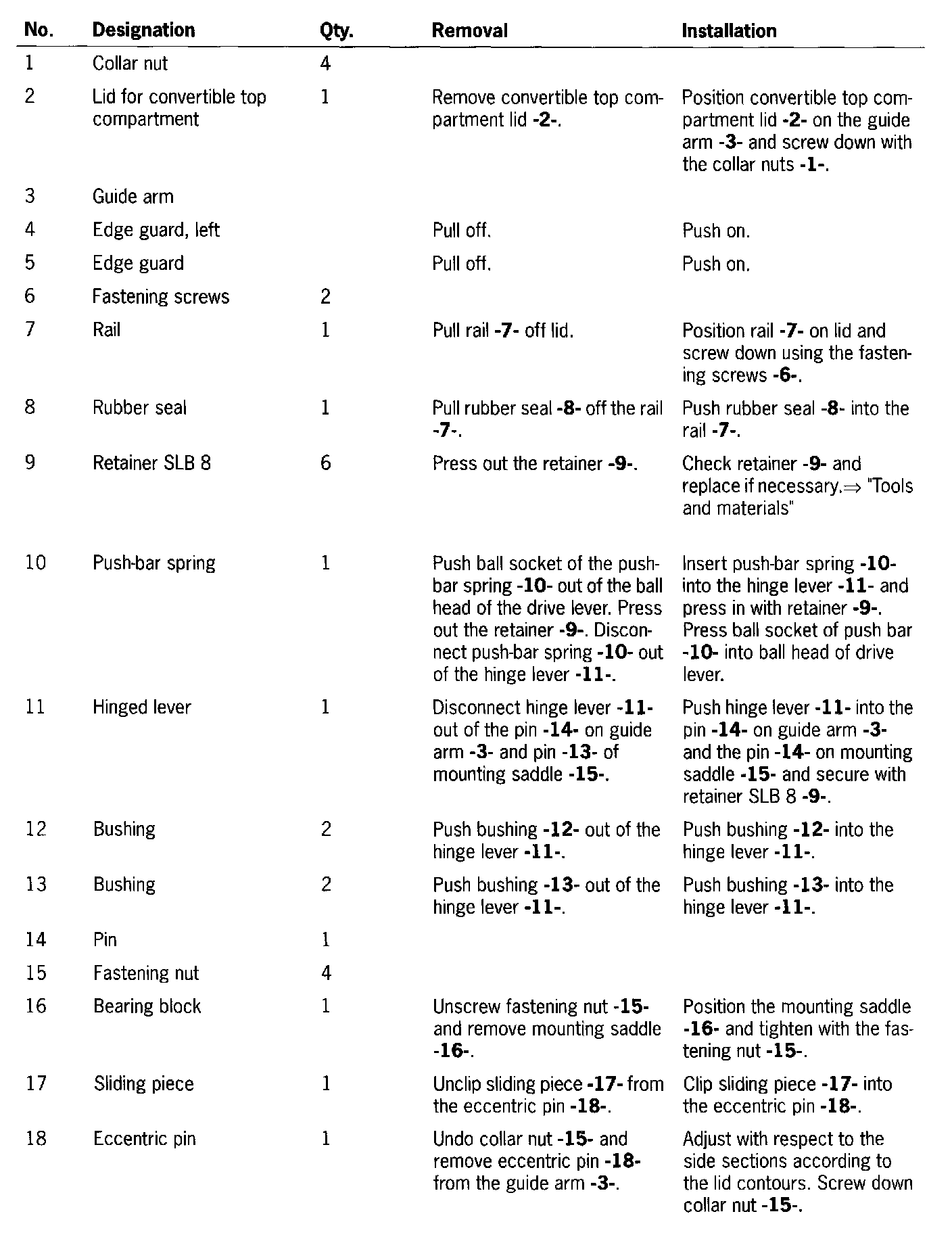 1. Adjust gap dimensions for convertible top compartment lid. If necessary, adjust body gap dimensions with the eccentric pin. See item -18-.