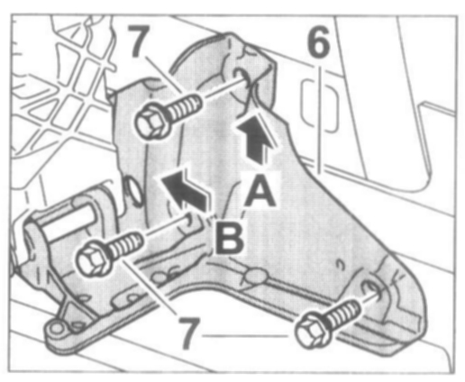 - Position the convertible-top support -6- on the roll-over bar and fasten it with the fastening screws -7-. Make sure that when tightening, the convertible-top support is pressed in the direction of arrows -A and B-.