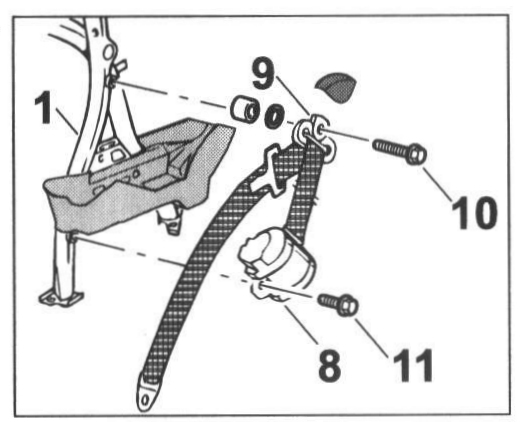 - Position the belt reel at the bottom -8- and the deflector at the top -9- on the roll-over bar -1- and fasten with the fastening screws -10, 11-.