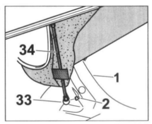 - Press the ball socket -33- of the tension cable -34- into the ball head of the adjusting piece -2- on the roll-over bar -1-.