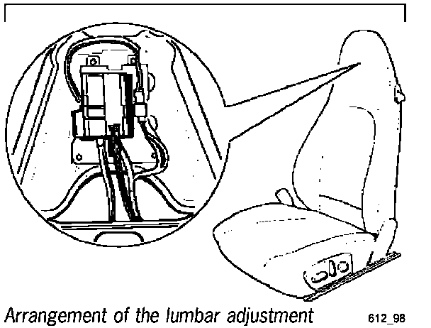 The lumbar support consists of two cushions which are inflated by means of a motor for lumbar support. The cushions are inflated or deflated to the required pressure one after the other beginning with the upper cushion. The pressure in the cushions is measured using a pressure sensor (regulating switch). The pressure sensor is located at the same height as the headrest and is integrated into the lumbar adjustment. Automatic adjustment of the lumbar support is carried out by actuating the switch for memory seat adjustment. The motor for lumbar adjustment is shown in Figure 611_98 together with both lumbar cushions. Automatic adjustment of the lumbar support is divided into two phases.