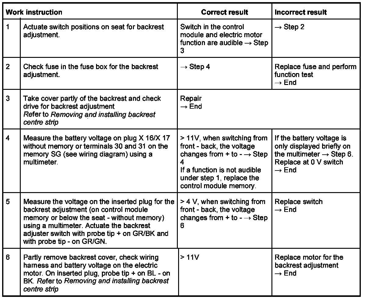 In the case of the complaint "backrest adjustment does not function", proceed according to test plan. As the seat functions vary, the test plan principally complies with the seat version with seat memory adjustment. Work aids: Use wiring diagram and multimeter