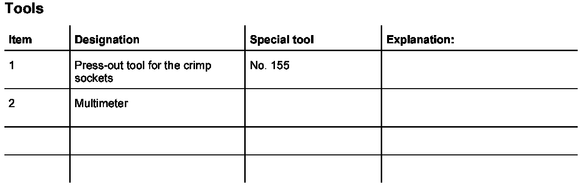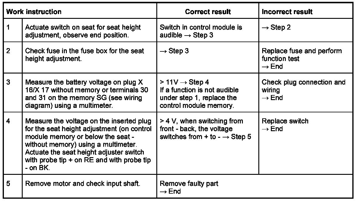 In the case of the complaint "seat height adjustment does not function", proceed according to test plan. As the seat functions vary, the test plan complies with the seat version with seat memory adjustment. Work aids: Use wiring diagram and multimeter