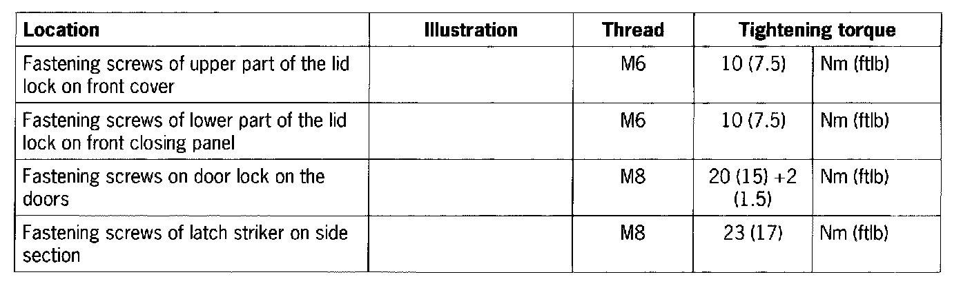 Check the tightening torque of the fastening screws of the door lock, the latch striker, the lower part of the lid lock and the upper part of the lid lock.