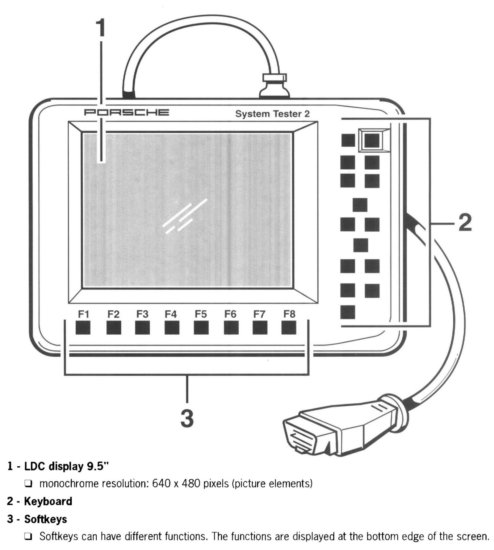 The Porsche System Tester II No. 9588 is a modular, portable diagnostic and measuring system. It can be used in any location to perform diagnostic tests on electronic control units. It consists of a computer unit, a main memory, a hard disk, a VGA display panel, a rechargeable nickel metal hydride battery and a measuring unit for measurement of current, voltage and resistance values.