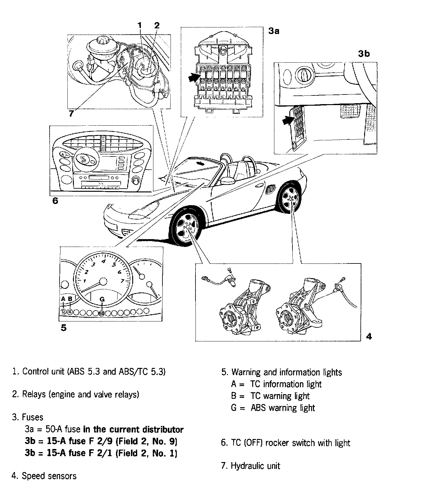 Compared with the ABS 5 (ABS 5 in the 993), ABS 5.3 has been optimized with regard to installed volume and weight. Control unit (No. 1), hydraulic unit (No. 7), pump-motor relay and valve relay (No. 2) of ABS 5.3 and ABS/TC 5.3 form a unit that is located next to the brake master cylinder.