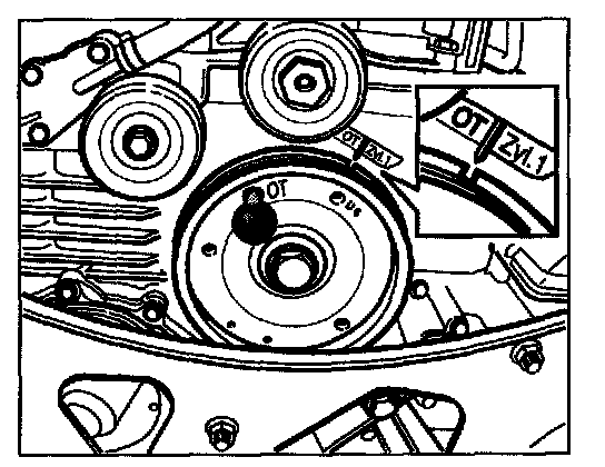 8. Turn the engine at the hexagon-head bolt (a/f 24) of the crankshaft belt pulley clockwise to TDC and then fix it with special tool fixing pins No. 9595/1 (use short fixing pin).