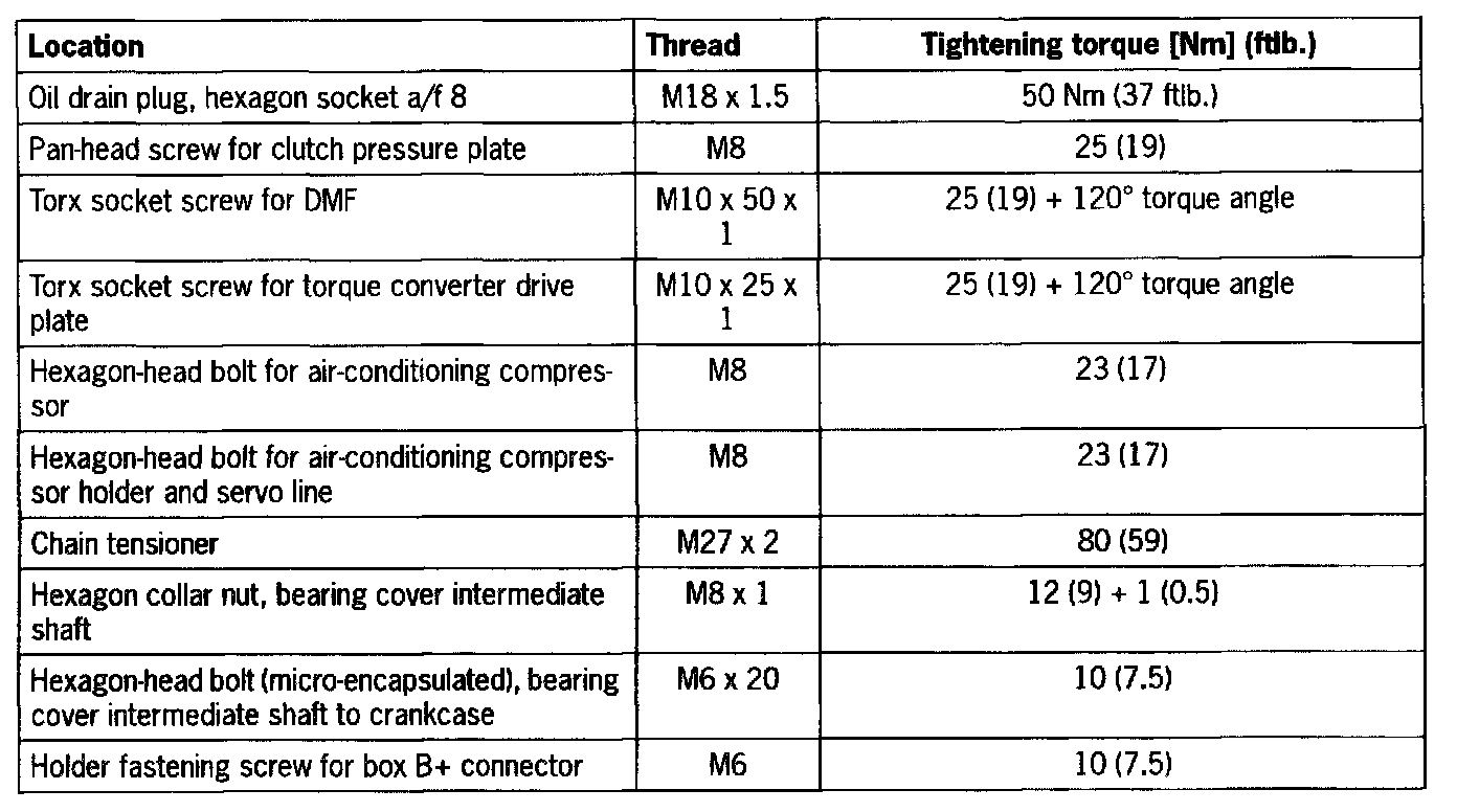 Tightening torque 25 Nm (19 ftlb.) + 120 degree torque angle
