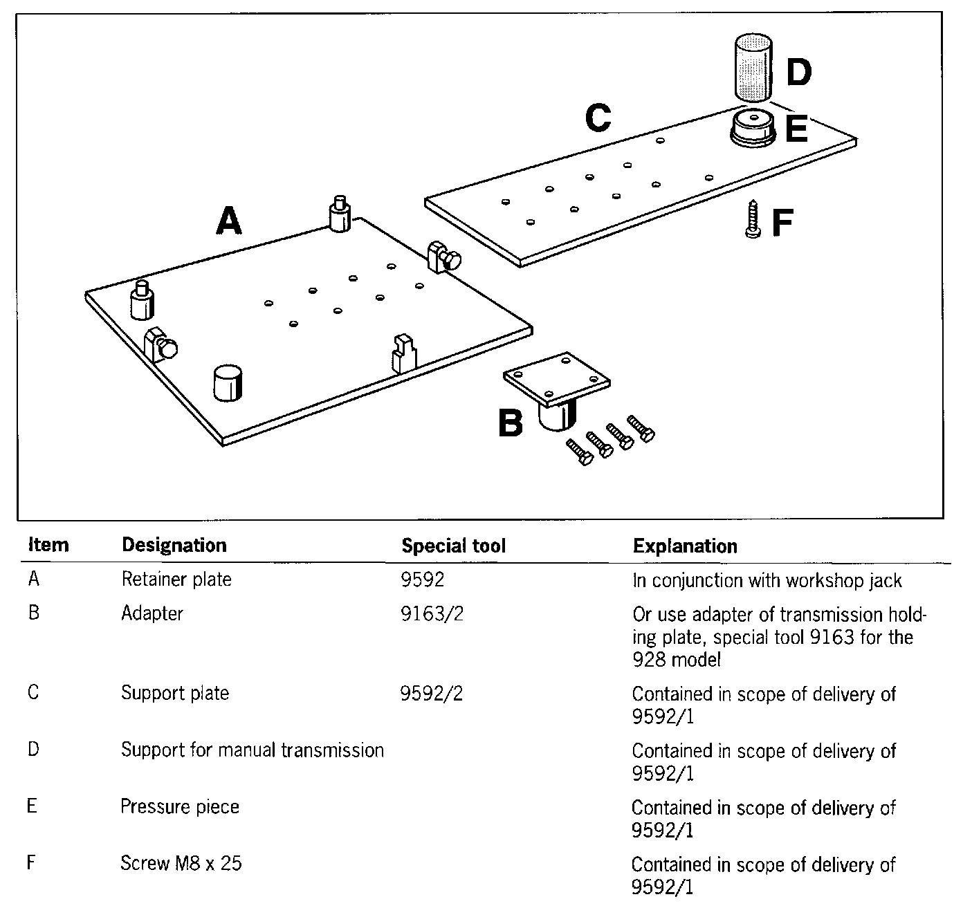 1. Lay the support plate 9592/1 on the rear of the retainer plate 9592 and fasten with four hexagon-head bolts M8 x 25.