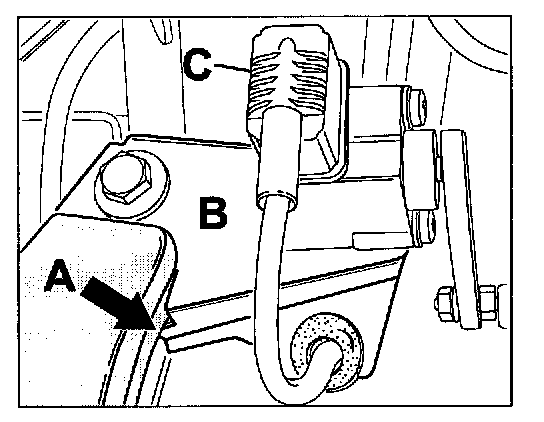 NOTE: Vehicles with automatic headlight beam adjustment. Bear in mind that the angle sensor bracket (B) must be in contact at the bottom when the bolts on the rear-axle support (A) are tightened. Once installed, the control module must be calibrated with the PST 2. The headlights must then be reset. -A- Rear-axle support- -B- Angle sensor bracket- -C- Angle sensor-