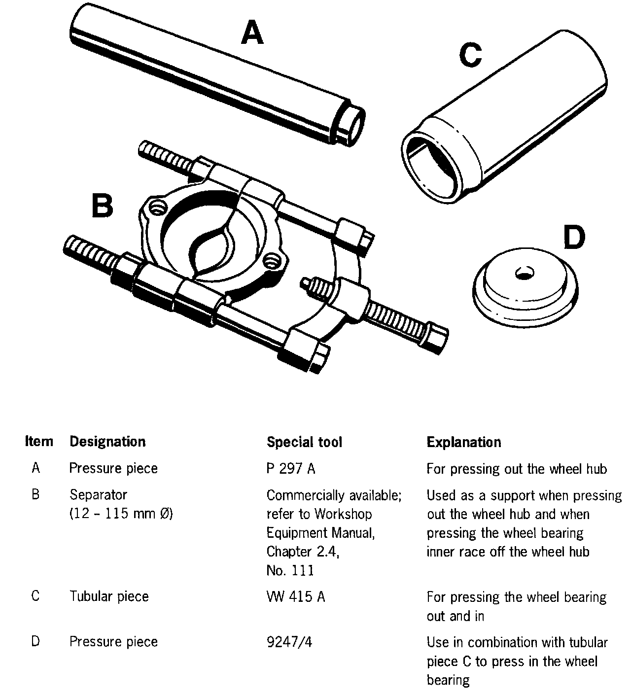 - Press out wheel hub with pressure piece P297 A (tool A).