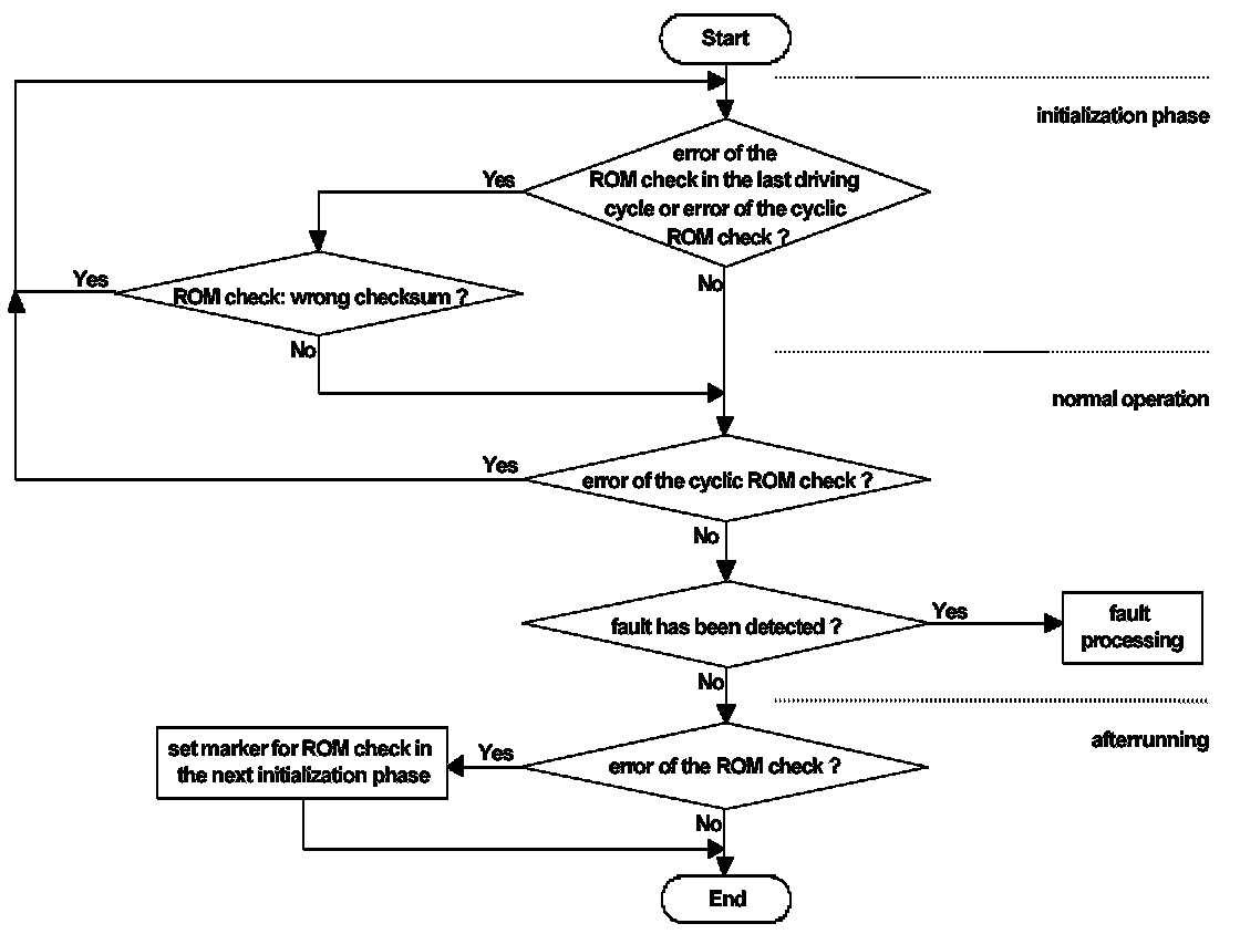 The ROM check is performed once per driving cycle after engine shutdown. In the case of a detected fault (a wrong checksum) the ROM check is repeated in the initialization phase of the following driving cycle. A detected fault in the initialization phase causes a RESET with no function running. Only a no-fault detection in the initialization phase will lead to a normal function and storing of the ROM - fault.