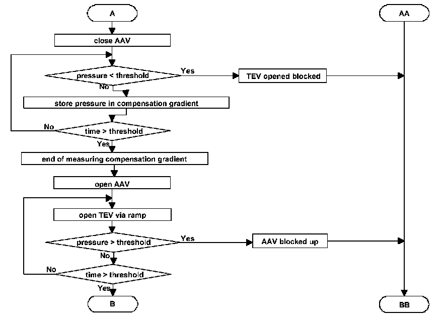 The AAV is opened and TEV are opened by a constant increase in their duty cycle. If the pressure reaches a specific threshold (vacuum), an AAV malfunction is detected (AAV blocked) and monitoring is stopped. If the pressure does not reach this specific threshold and the TEV has reached a certain duty cycle, the AAV is closed after a time delay.