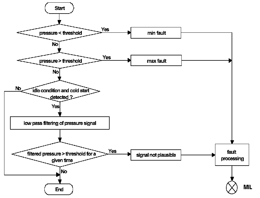 The electronic plausibility check is continuously performed. The pressure signal may be faulty due to wiring interruption or a short circuit. The pressure signal is limited to a minimum and maximum value. If the sensor signal reaches one of these thresholds, a sensor signal minimum or maximum fault is detected.