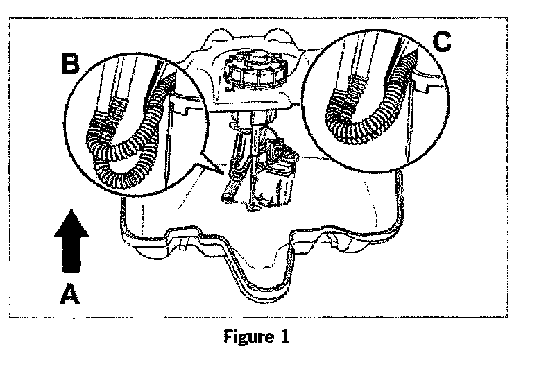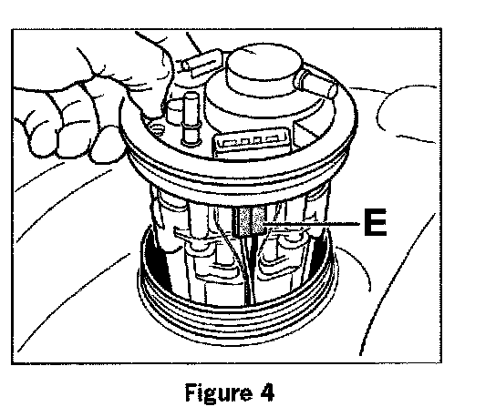 1. Correct the routing of the fuel pressure pipe in fuel tank. "Figure 1, Item B" shows the excessive line bend in the pressure pipe which is blocking the fuel level sensor float.